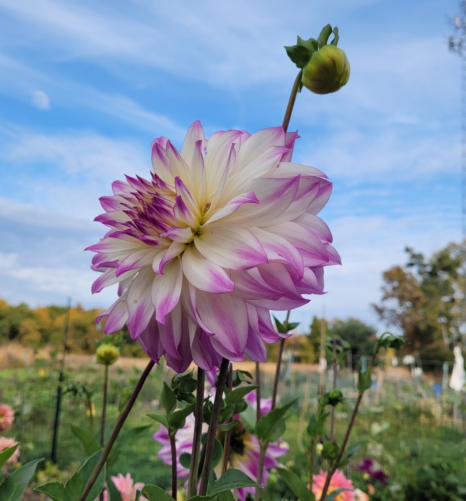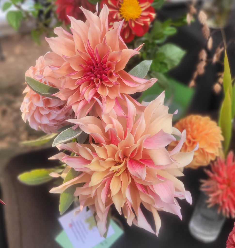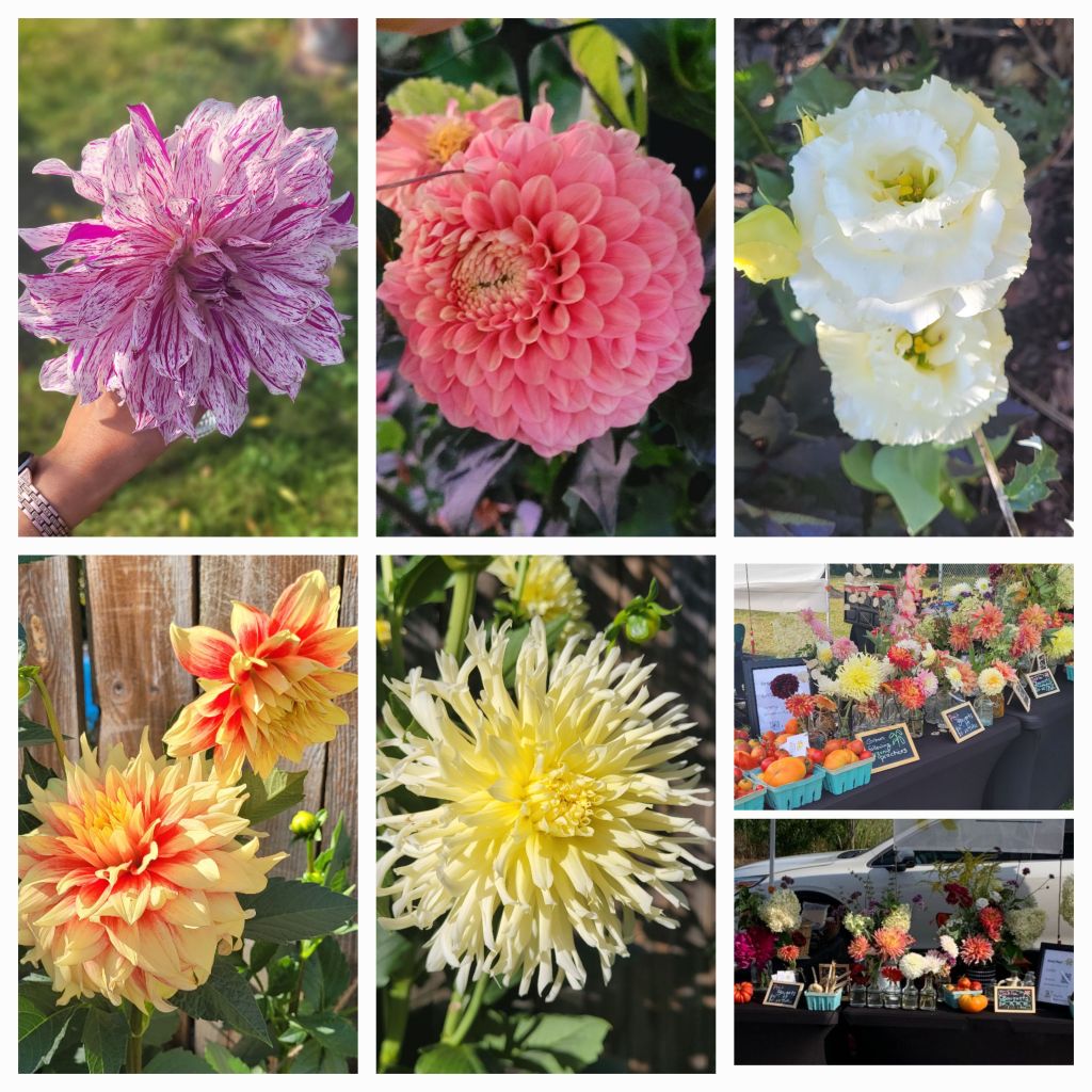 Pending spring weather, the main season for our dahlias at the farmers markets happens in late July through mid-October, featuring summer and fall dahlias & heirloom tomatoes