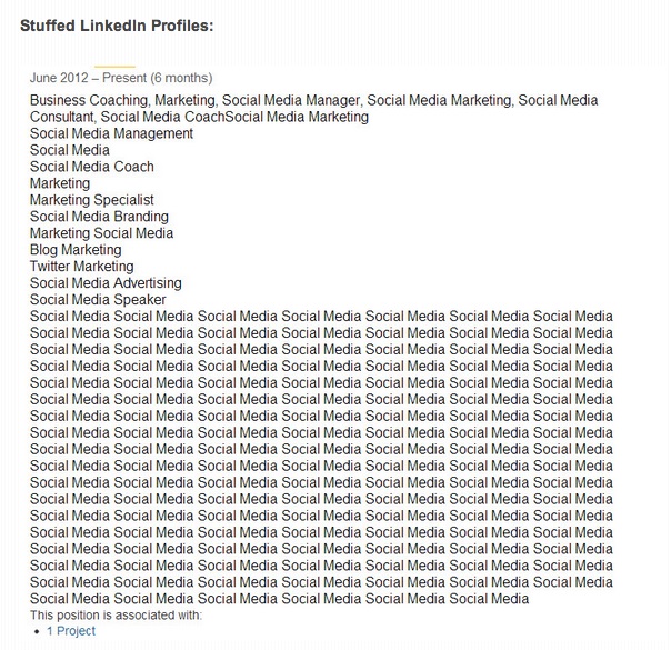 Previous Image Next Image Stuff LinkedIn Profile 2012 Example of an actual LinkedIn job descriptions which is nothing but stuffed keywords, to rank high in seach.